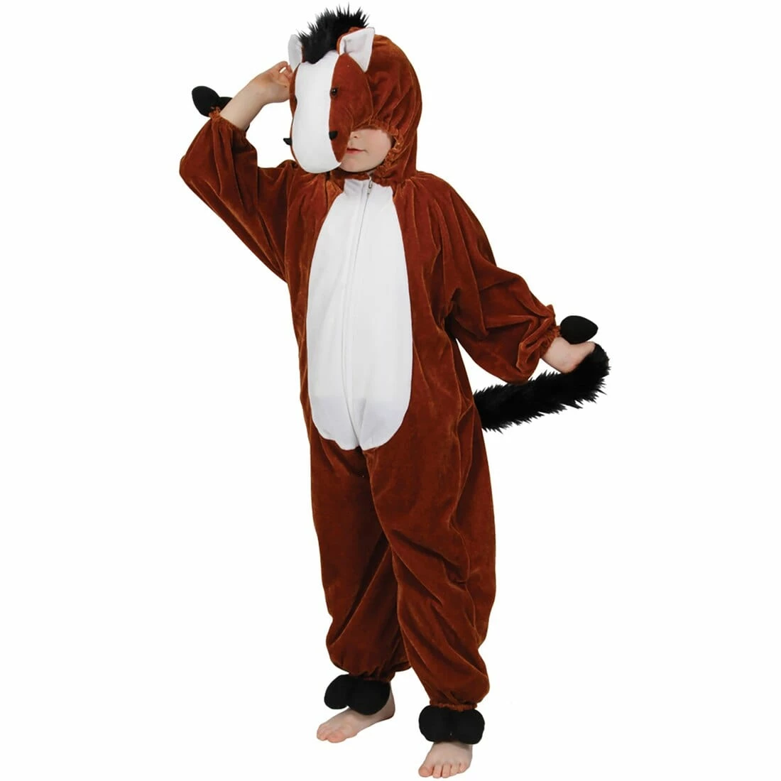 This fabulous quality, soft plush fabric, one-piece, animal costume has a zip fastening front, a detailed, padded headpiece at the top of the elasticated hood and a soft tail.
